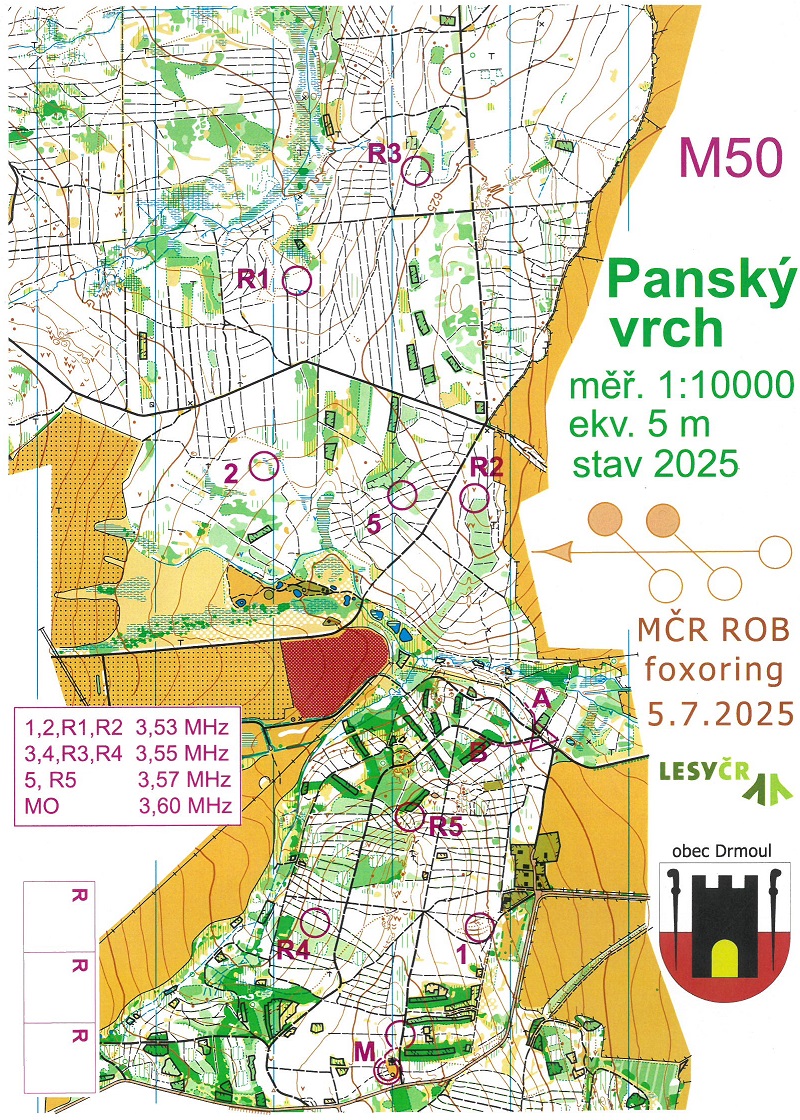 Mistrovství ČR v ROB, foxoring 3,5 MHz, 5. 7. 2025, Drmoul, mapa Panský vrch (nahoře, trať kategorie M50)