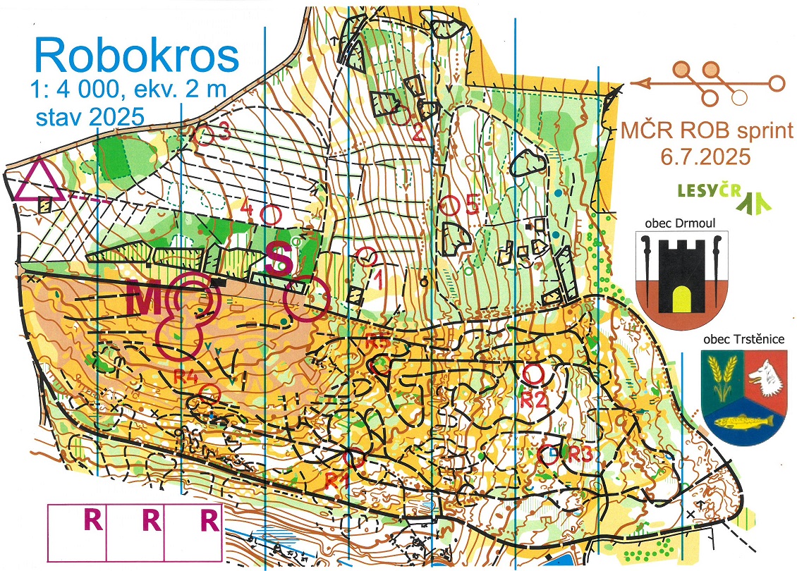 Mistrovství ČR v ROB, sprint 3,5 MHz, 6. 7. 2025, Drmoul, mapa Robokros (dole, všechny kontroly)